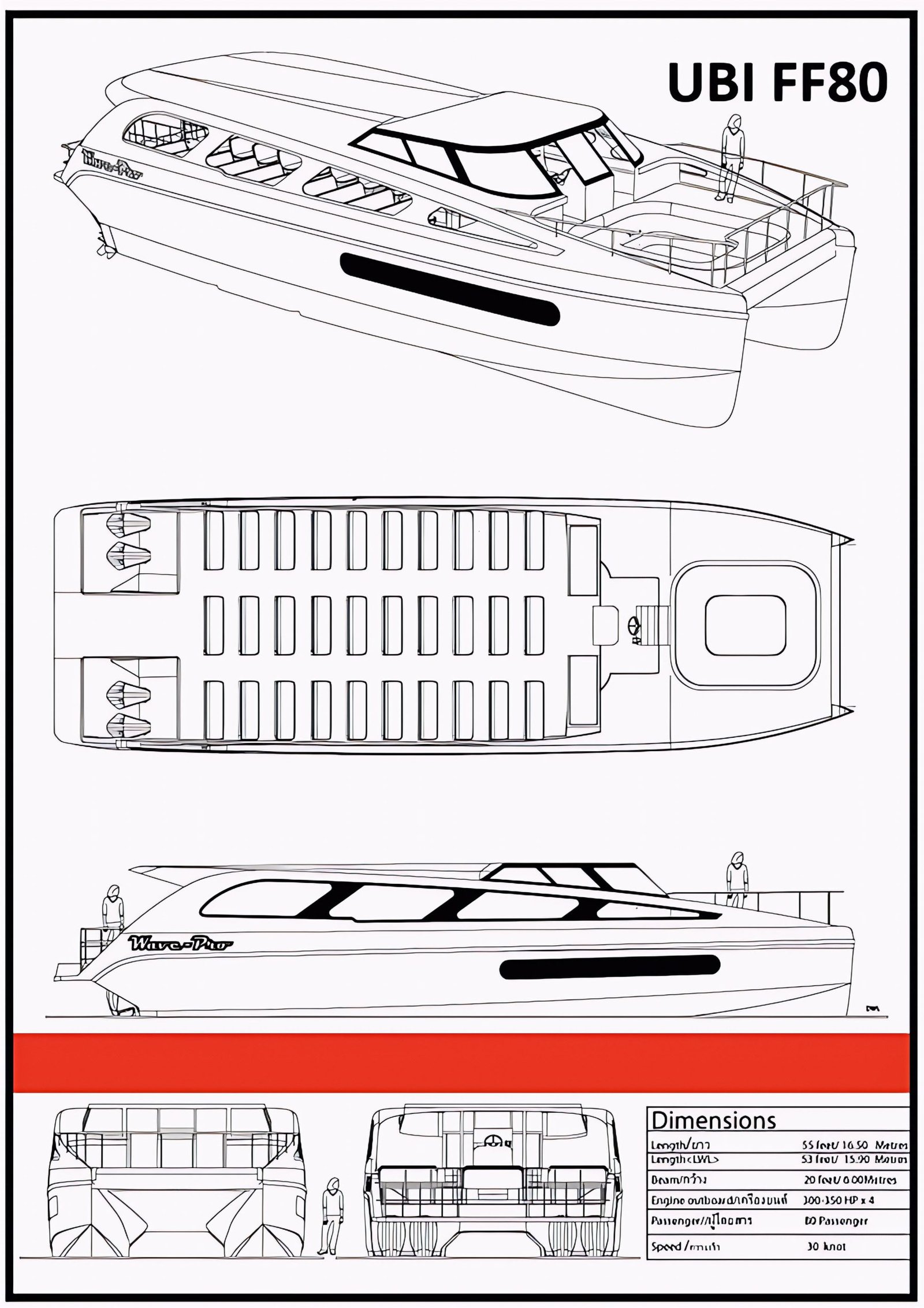 The UBI FF80 is a purpose-designed transportation ferry primarily for short haul routes. With a passenger capacity of up to 80 depending on layout and seating arrangements, it offers a very viable alternative for the operator wishing to move multiple guests at speed, in comfort and economically.