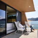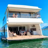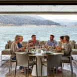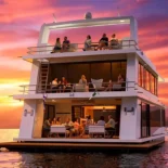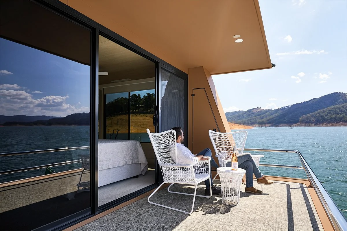 Full-height stainless steel safety railings around entire perimeter, meeting maritime safety standards whilst maintaining elegant visual lines.