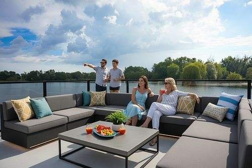 reinforced rub rail.Rooftop sun pad included; upgraded lounge seating is optional.