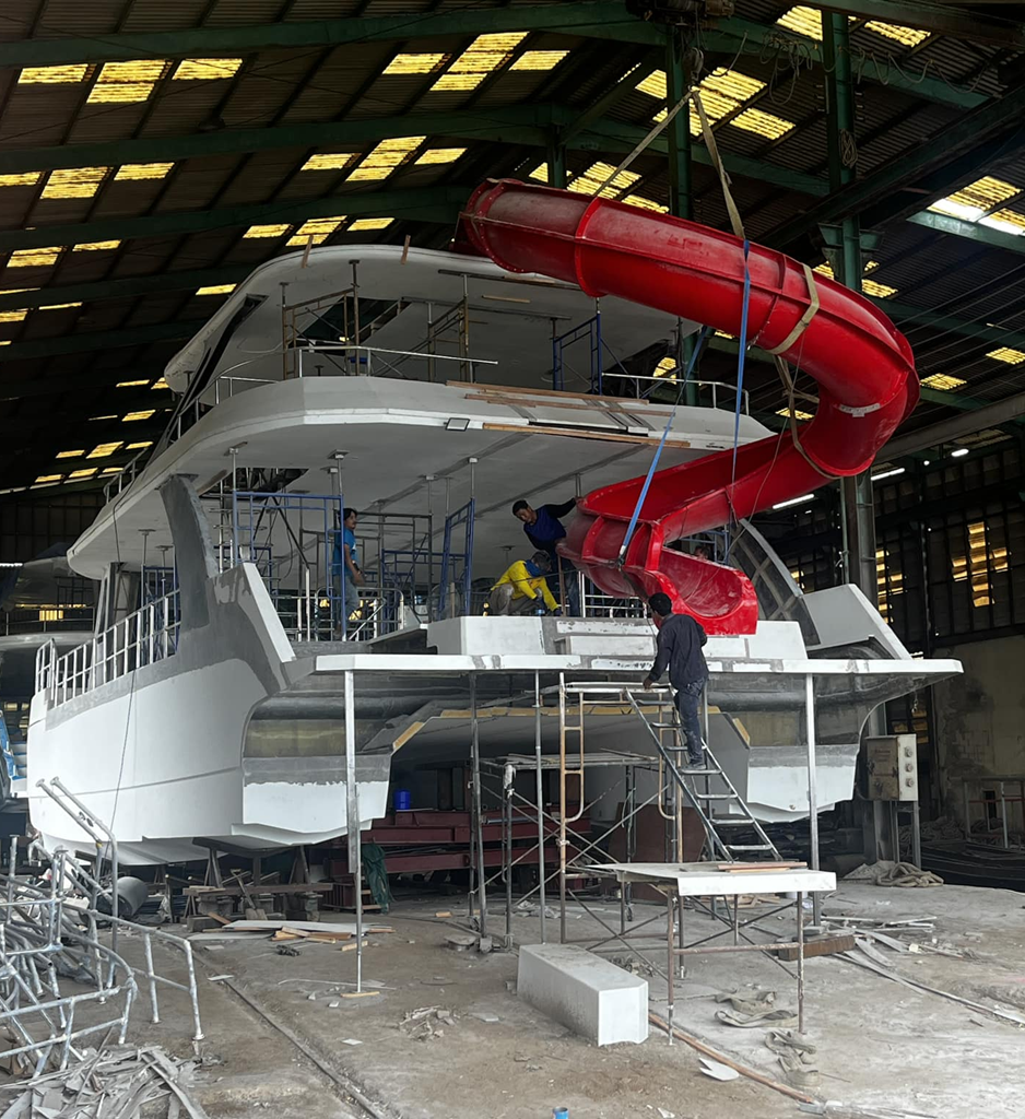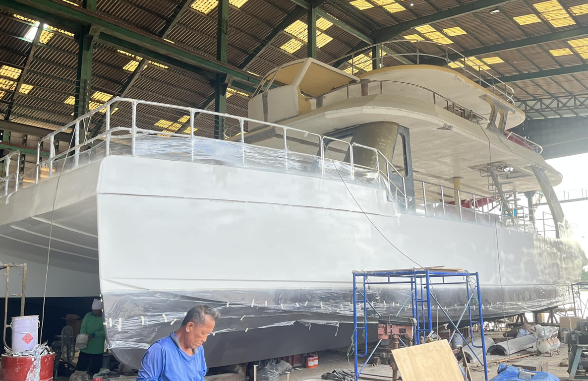 - Hull & Deck: Heavy-duty commercial anti-skid deck coating, stainless steel cleats (12x), heavy-duty fenders (10x), bow access platform, full perimeter safety rails, six boarding gates (3 port, 3 starboard)