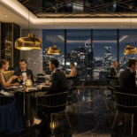 Formal dining space with panoramic windows on three sides. High ceilings, sophisticated lighting, and premium furnishings create an elegant atmosphere.
