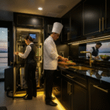 Full-service galley positioned centrally for efficient service to both indoor salon and outdoor terrace. Direct access from dry stores and cold rooms.