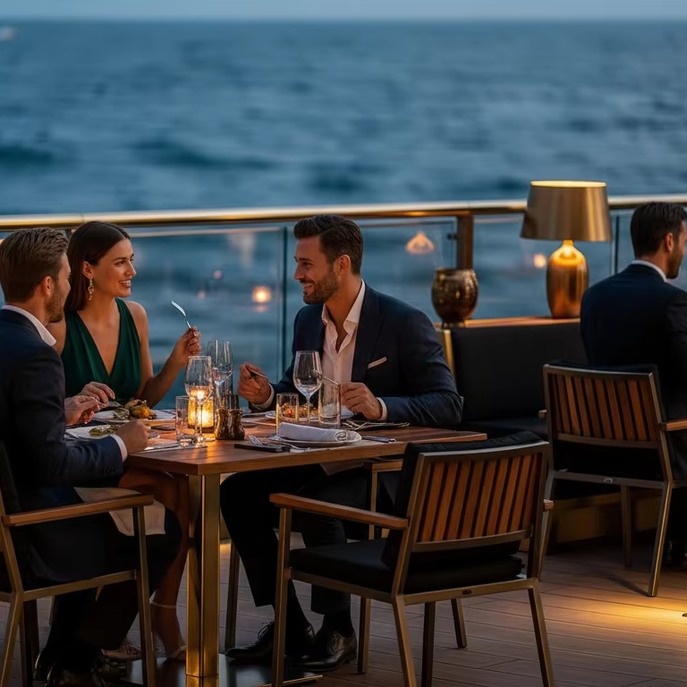 The catamaran hull form minimises roll motion and provides a stable, comfortable dining platform even with guest movement. Critical for fine dining service and guest confidence.